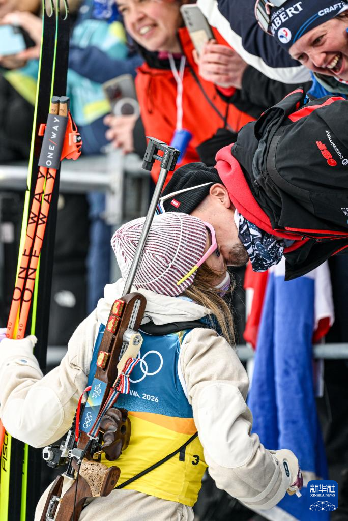 2月18日,法国选手米舍隆(下)在赛后庆祝时亲吻看台上的亲友。