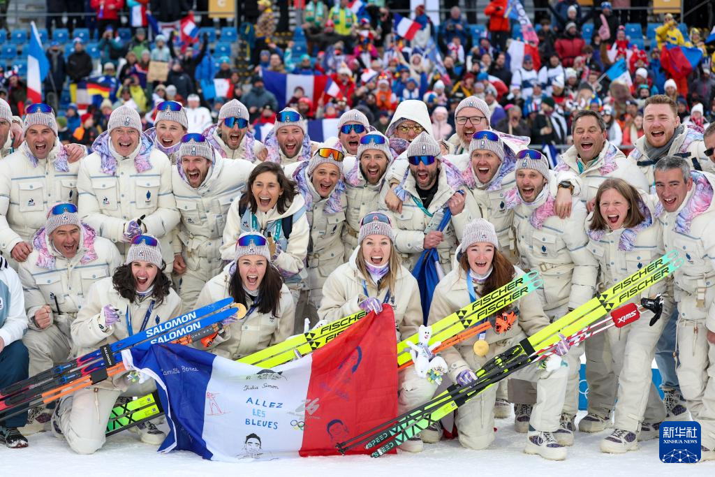 2月18日,法国队运动员和教练员在颁奖仪式后庆祝。