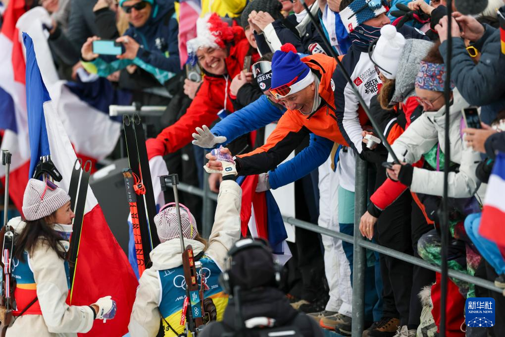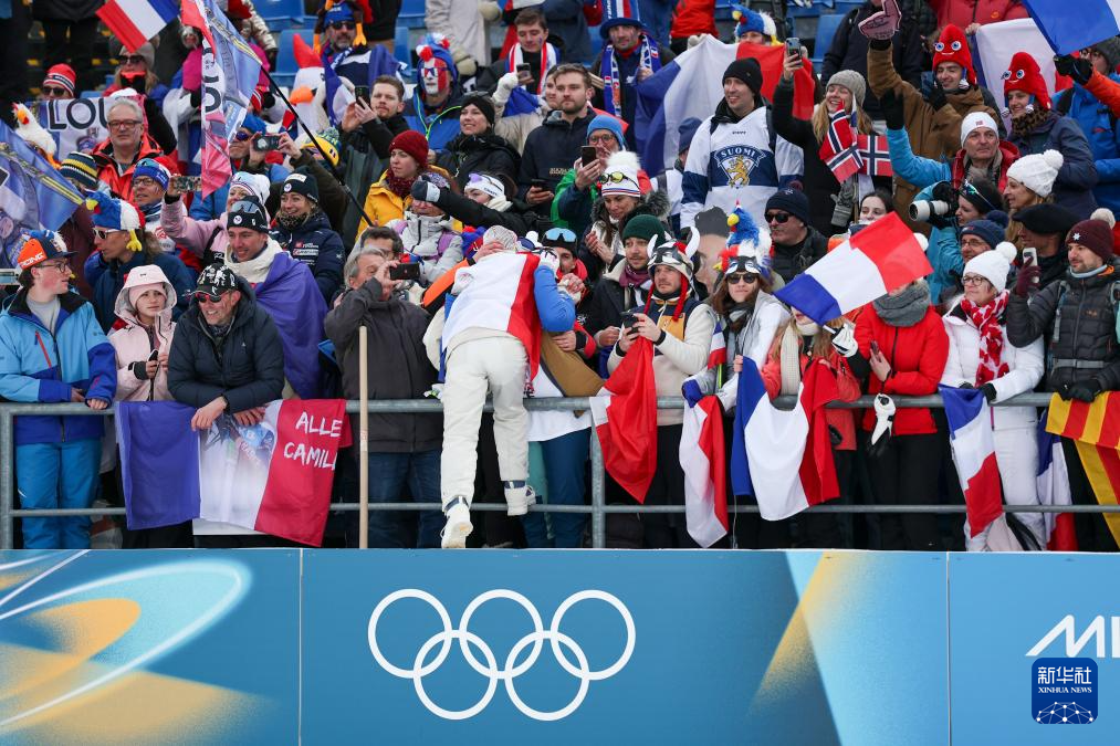 2月18日,法国队选手和看台上的法国观众庆祝。