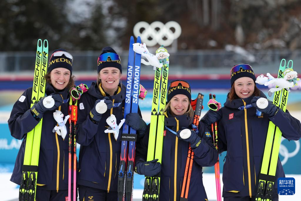 2月18日,亚军瑞典队在颁奖仪式后庆祝。