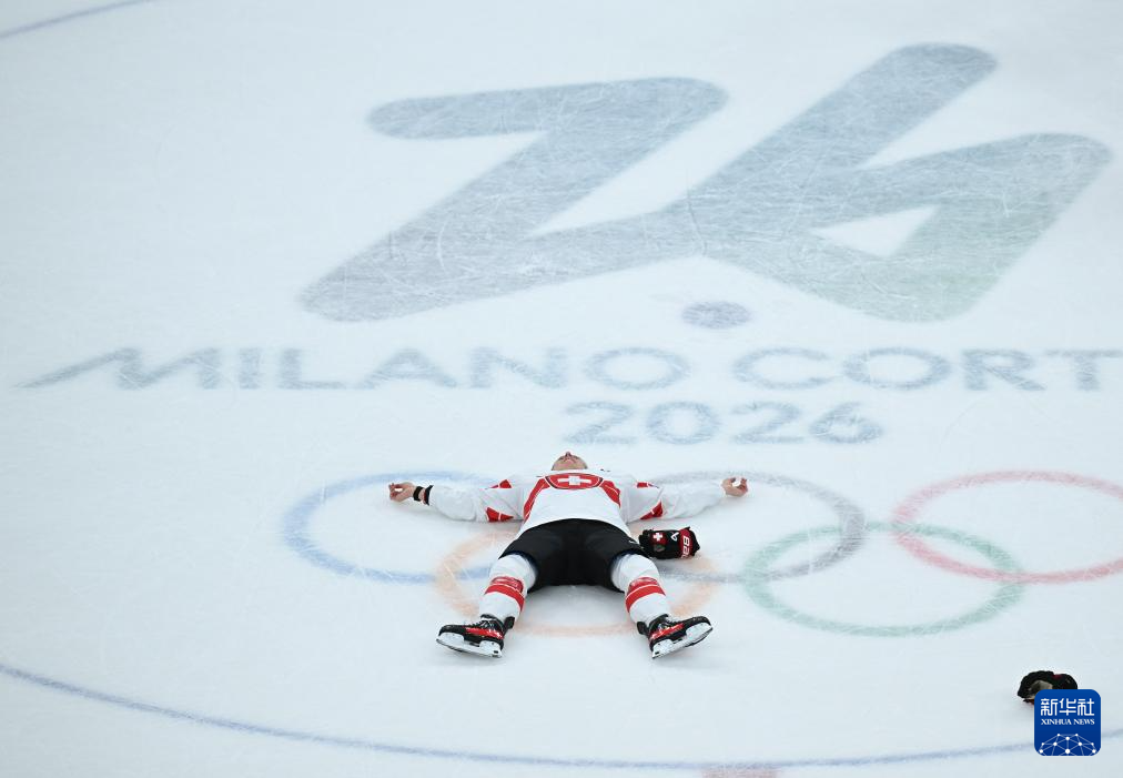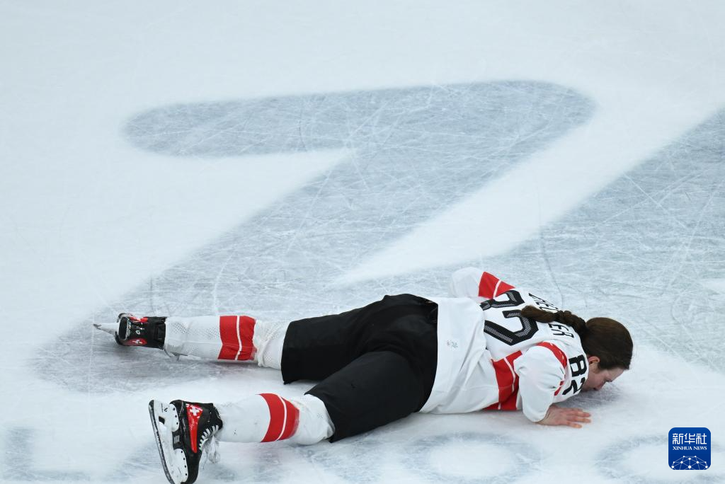 2月19日,瑞士队球员拉拉·斯塔尔德在赛后躺在冰面上庆祝胜利。