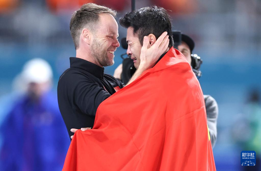 2月19日,宁忠岩(左)在赛后与教练庆祝。