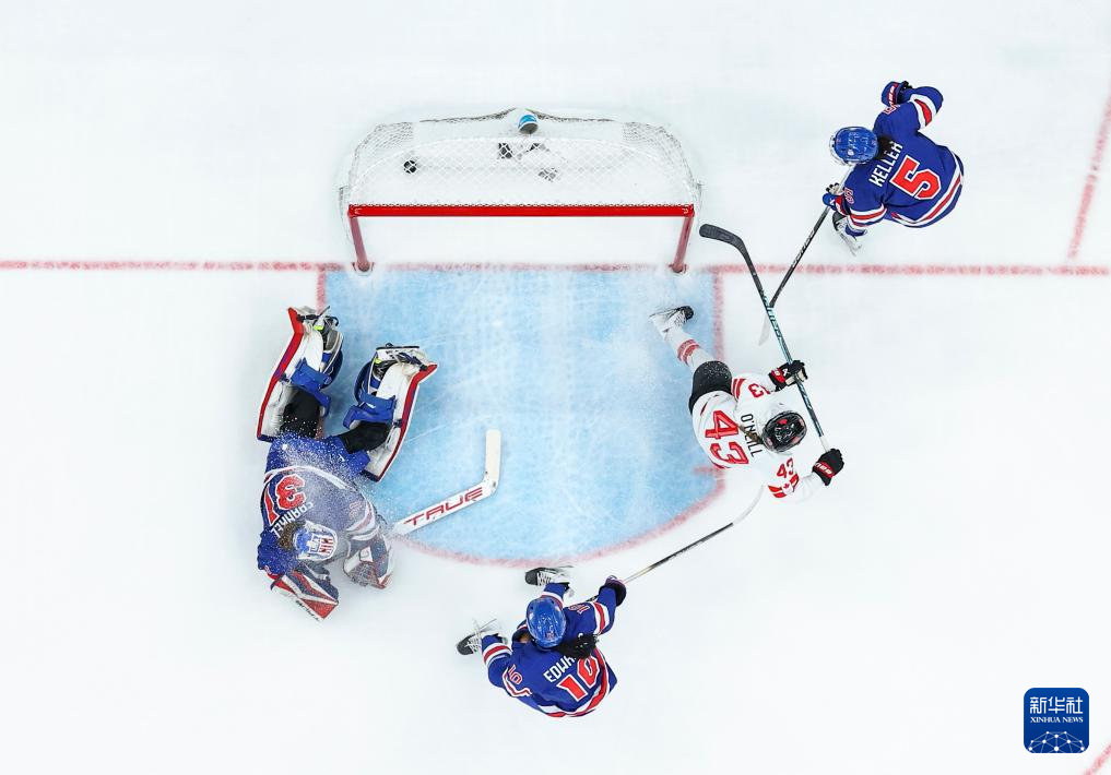 2月19日,加拿大队球员奥尼尔(右二)在比赛中射门得分。