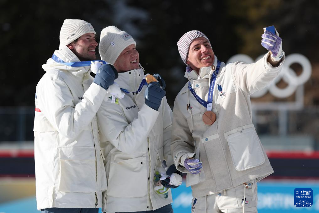 2月20日,亚军挪威选手斯图拉·霍尔姆·莱格雷德、冠军挪威选手约翰内斯·戴尔、季军法国选手康坦·菲永·马耶(从左到右)在颁奖仪式上自拍合影。