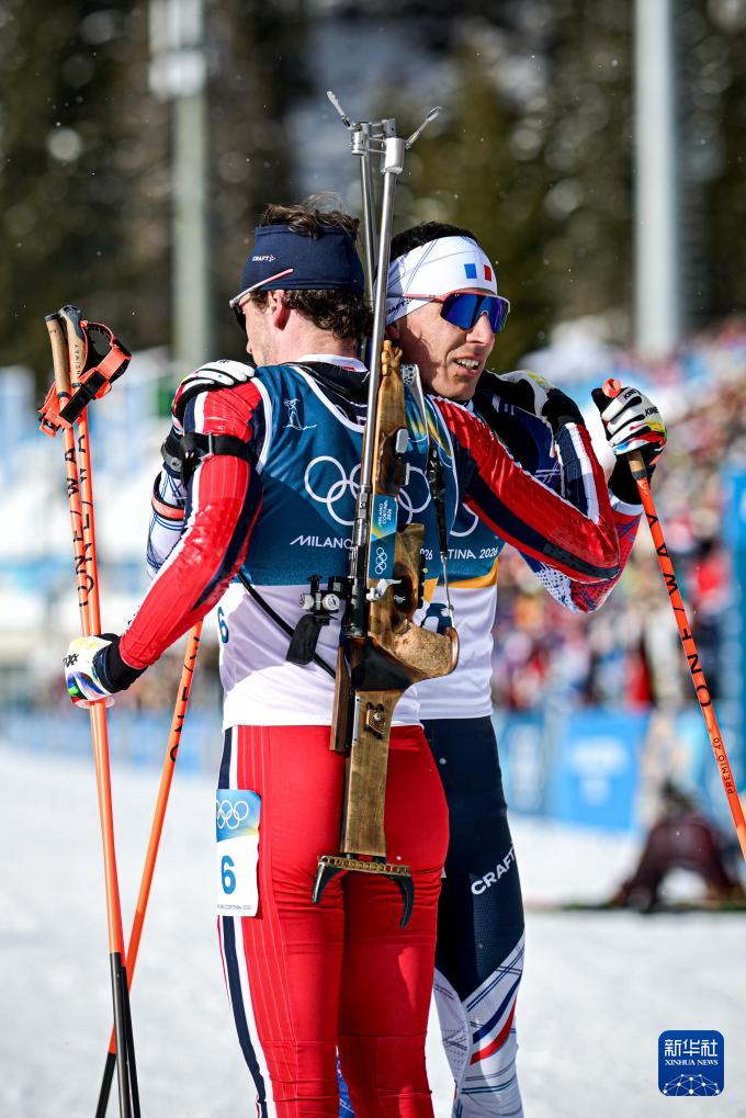2月20日,亚军挪威选手斯图拉·霍尔姆·莱格雷德(左)和季军法国选手康坦·菲永·马耶在赛后拥抱庆祝。