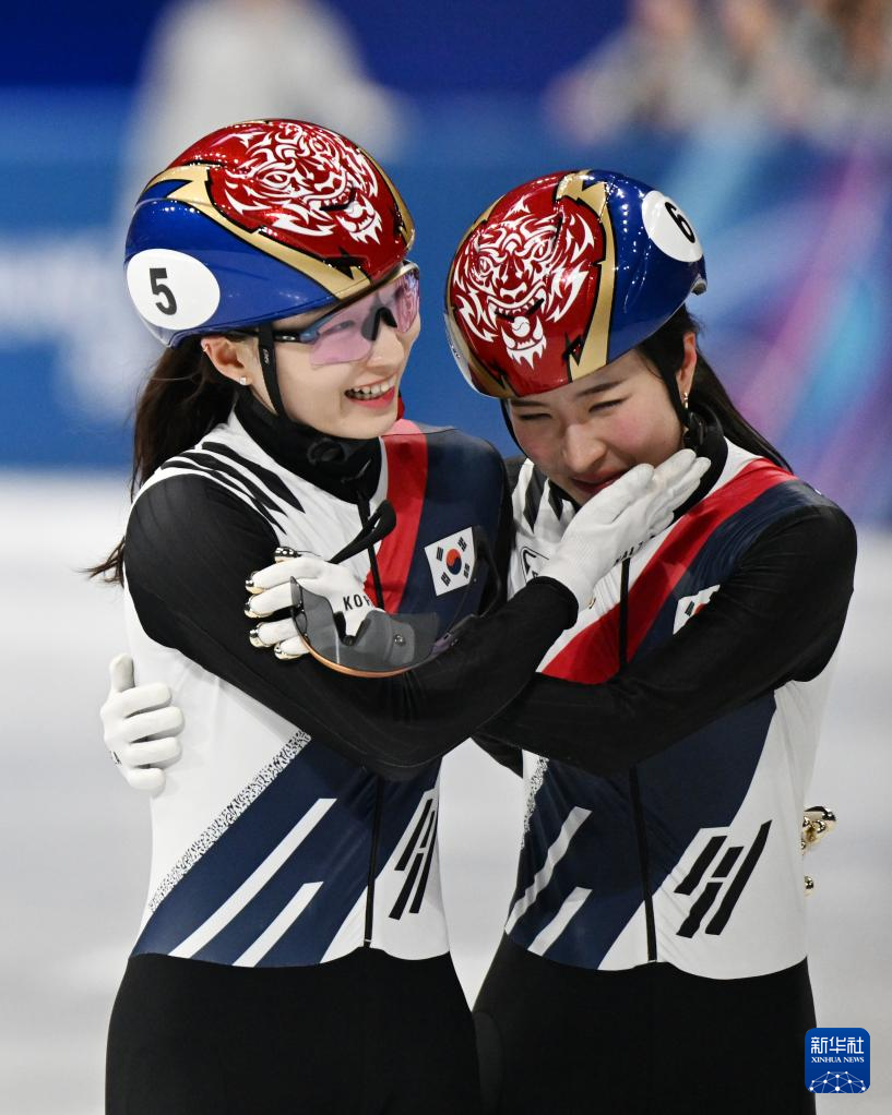 2月20日,冠军韩国选手金吉莉(右)与亚军韩国选手崔敏静在比赛后庆祝。