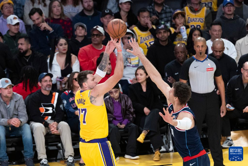2月20日,湖人队球员东契奇(左)在比赛中投篮。