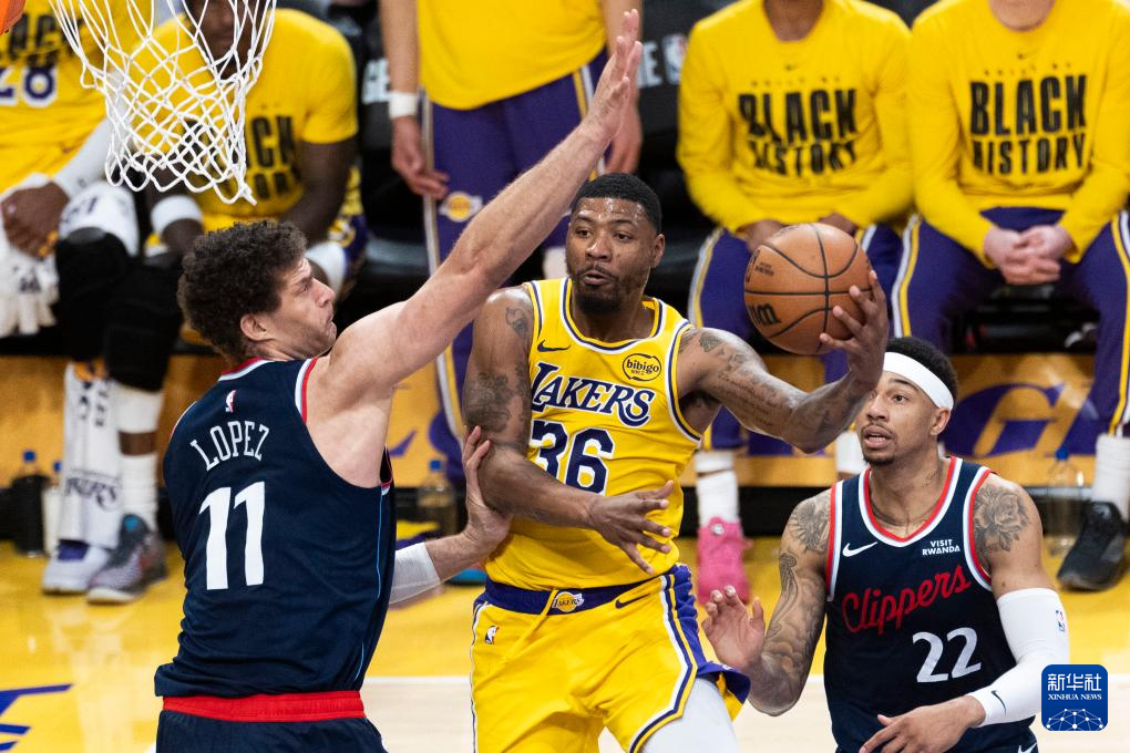2月20日,湖人队球员斯玛特(中)在比赛中上篮。