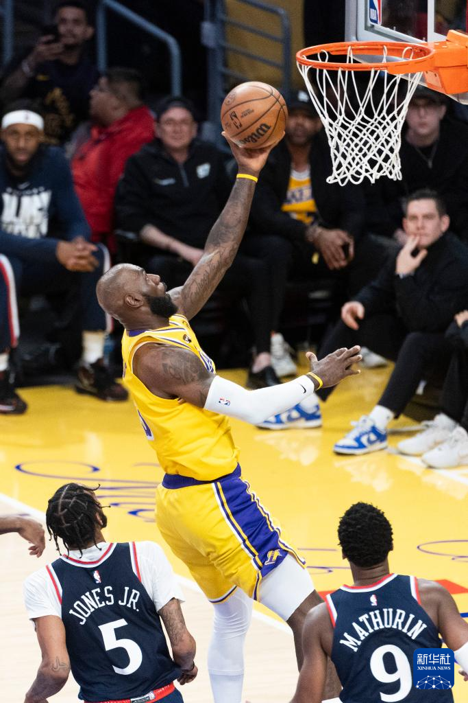 2月20日,湖人队球员詹姆斯 (中)在比赛中上篮。