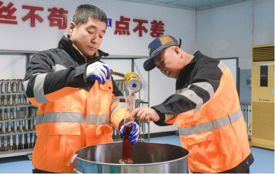 屈云鹏和同事量取减速顶液压油(右一)