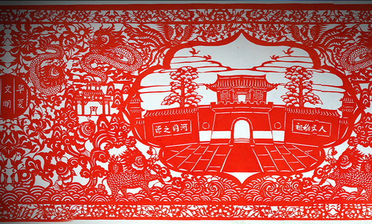 于是我決定回家專門剪紙,但是我父母認(rèn)為鉸花都是老婆婆們閑著沒事做的事,你一個(gè)男孩子還是應(yīng)該好好賺錢。就這樣我跟父母僵持了很久,但最后還是我拗著性子從外邊回到了我們農(nóng)村老家,開始尋找會(huì)剪紙的老人,去記錄、去詢問、學(xué)習(xí)我們地區(qū)傳統(tǒng)的剪紙民俗知識(shí)。因?yàn)楝F(xiàn)在像剪紙這個(gè)藝術(shù),在我們的地區(qū)還僅是一些老人出自一些喜好去剪、去做,但隨著這些老人的去世,這些作品也就會(huì)隨著一把火被燒掉。我希望我能把這些東西都保留下來,我希望有更多的人去了解我們地區(qū)的剪紙文化,所以我就下決心收集這些剪紙的資料,去申報(bào)非物質(zhì)文化遺產(chǎn)名錄。想要申報(bào)還要去做很多的事情,一是去尋找這些傳世的老作品,另外就是要擴(kuò)大孟津剪紙的影響力,參加各種比賽去獲獎(jiǎng)。那時(shí)我白天去尋找老藝人,晚上就自己在屋里埋頭創(chuàng)作,每天晚上都會(huì)剪到凌晨一點(diǎn)多。我媽本來是反對的,但是當(dāng)她看到每晚我都會(huì)剪到很晚,她就明白了我是真心喜歡這個(gè)事兒,就慢慢地開始心疼我。后來她也幫助我開始粘貼,像我剪的《都說我孟津好風(fēng)光》,這個(gè)作品長13米,沒有那么長的紙,我們就一起粘貼?;巳齻€(gè)多月剪完,家里邊沒有那么大粘貼裝裱的空間,我父母就站在我們家院子的平房頂上一起把它鋪開,一個(gè)一個(gè)地粘起來裱好。