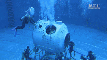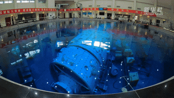 這里是航天員模擬失重水槽訓練場。當飛船繞地心運動時,會產生失重。航天員要在失重狀態(tài)下進行空間出艙活動和裝配維修等任務。實踐證明,模擬失重水槽訓練是在地面上進行航天員艙外活動訓練的最為有效方法。