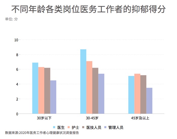 ????? 根據(jù)報告顯示,男性醫(yī)生的抑郁得分為8.4分,女性醫(yī)生的抑郁得分為6.9分; 男性護(hù)士的抑郁得分為7.5分,女性護(hù)士的抑郁得分為6.7分;男性醫(yī)技人員的抑郁得分為 6.4分,女性醫(yī)技人員的抑郁得分為5.8分, 男性管理人員的抑郁得分為6.1分,女性管理人員的抑郁得分為4.5分。其中,各個崗位的男性醫(yī)務(wù)工作者的抑郁得分都高于女性醫(yī)務(wù)工作者。