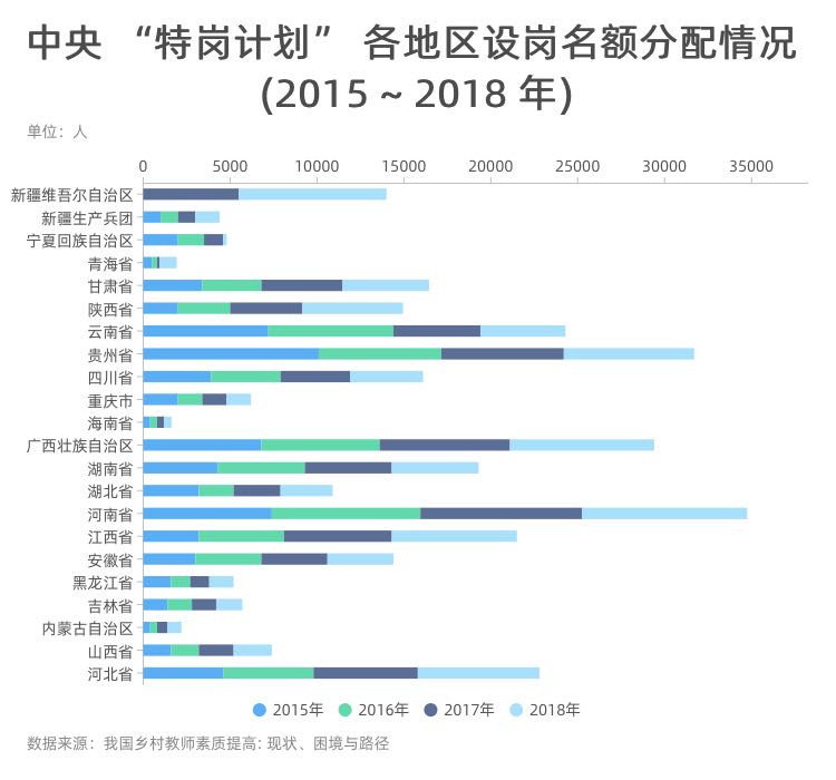 ????? 從目前鄉(xiāng)村教師的培養(yǎng)和補充來看, 我國采取了多渠道補充模式。為加強鄉(xiāng)村教師的培養(yǎng)和補充。各地在不斷完善統(tǒng)一公開的招考制度的基礎上, 結合“ 三支一扶”“ 特崗計劃”“公費師范生”“ 碩師計劃”“全科教師”等專項計劃,在短時間內(nèi)培養(yǎng)了大批教育碩士、免費師范生等優(yōu)秀師資,有效地補充了鄉(xiāng)村中小學師資隊伍。教育部公布的數(shù)據(jù)顯示,2018年全國計劃招聘“特崗計劃”教師9萬人,其中河南0.95萬人、廣西0.83萬人、貴州0.75 萬人、江西0.72萬人。