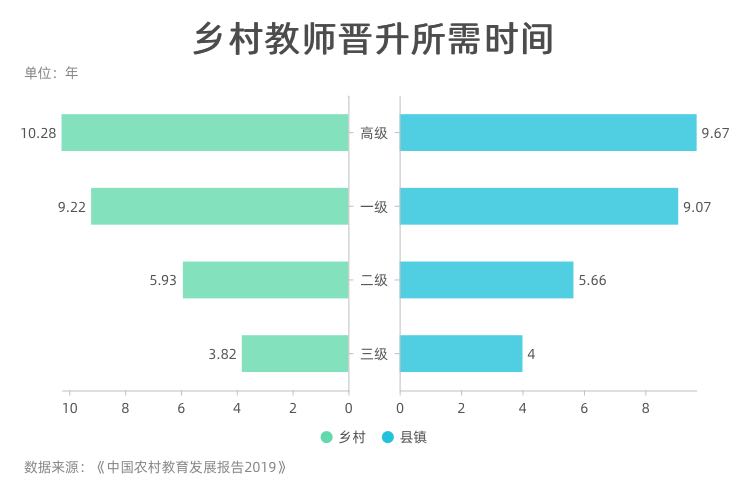 ????? 相較收入而言,和城里的老師比起來,鄉(xiāng)村教師的職稱晉升更難一些。盡管職業(yè)初期,鄉(xiāng)村教師花費更少的時間升到了三級,但在更高的二級、一級、高級職稱晉升中,鄉(xiāng)村教師的步伐明顯比縣鎮(zhèn)教師慢下來了。