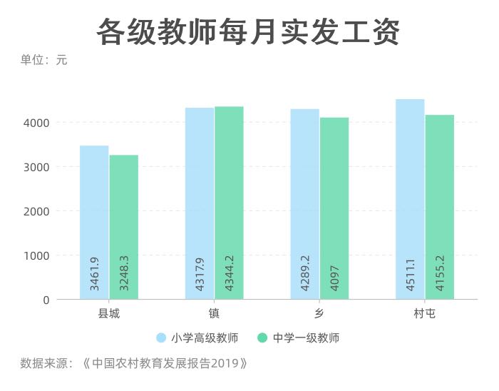 ????? 教育部等六部門2020年印發(fā)《關于加強新時代鄉(xiāng)村教師隊伍建設的意見》,明確提出,完善鄉(xiāng)村教師待遇保障機制,確保平均工資收入水平不低于或高于當?shù)毓珓諉T平均工資收入水平。由于國家補貼,鄉(xiāng)村教師的收入水平還是能夠維持在不錯的水平上。根據(jù)《中國農(nóng)村教育發(fā)展報告2019》的數(shù)據(jù),一個小學高級教師崗位,在縣城小學只能拿到3461.9元,在村屯小學卻能拿到4511.1元。一個中學一級教師崗位,縣城中學開出3248.3元的月工資,村屯中學卻能給到4155.2元。