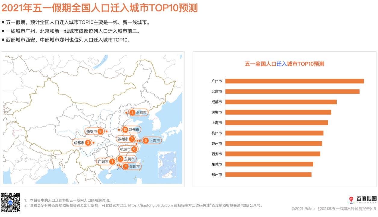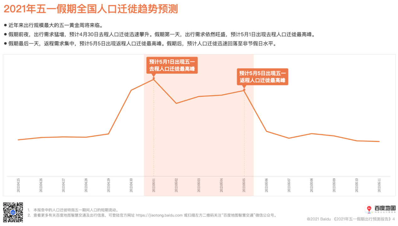 ????? 今年“五一”假期繼續(xù)延續(xù)“加長版”,5天長假點(diǎn)燃了眾多消費(fèi)者的出游熱情。根據(jù)中國旅游研究院的預(yù)測,今年“五一”國內(nèi)旅游出游有望達(dá)到2.2億人次,按可比口徑甚至超過疫前同期水平。根據(jù)百度地圖《2021年五一假期出行預(yù)測報(bào)告》,近年來出行規(guī)模最大的“五一”黃金周將來臨。預(yù)計(jì)5月1日出現(xiàn)五一去程人口遷徙最高峰。
