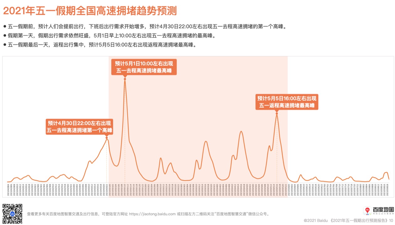 ????? 假期前,預(yù)計(jì)人們會提前出行,下班后出行需求開始增多,預(yù)計(jì)4月30日22:00左右出現(xiàn)五一去程高速擁堵的第一個高峰。