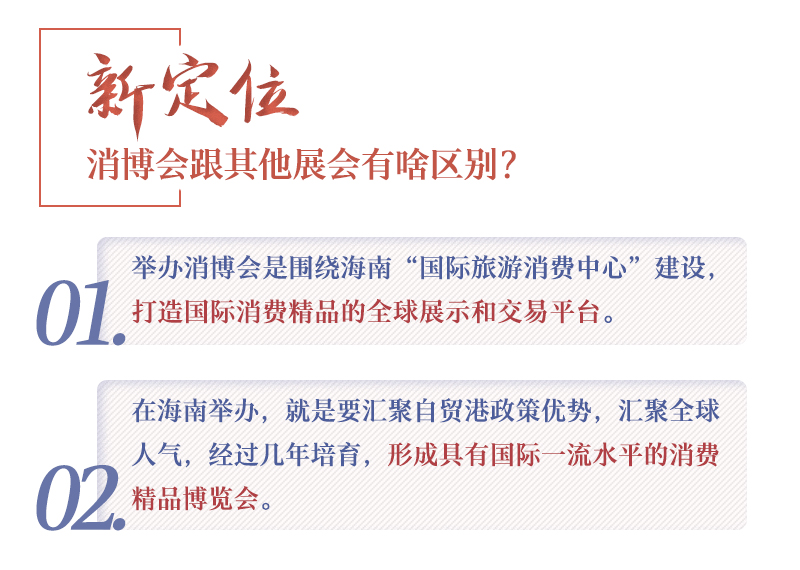 ??? 消博會(huì)的舉辦背后,是來(lái)自海南自貿(mào)港一系列政策紅利的支撐。早在2020年6月1日,由中共中央、國(guó)務(wù)院印發(fā)的《海南自由貿(mào)易港建設(shè)總體方案》中,就已經(jīng)明確了海南國(guó)際旅游消費(fèi)中心的定位,提出舉辦中國(guó)國(guó)際消費(fèi)品博覽會(huì)。而“培育國(guó)際消費(fèi)中心城市”和“辦好進(jìn)博會(huì)、廣交會(huì)、服貿(mào)會(huì)及首屆中國(guó)國(guó)際消費(fèi)品博覽會(huì)等重大展會(huì)”,更是被分別寫入“十四五”規(guī)劃綱要和今年的政府工作報(bào)告。