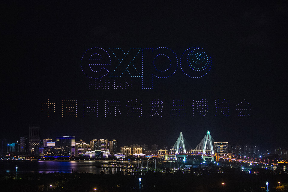 ??? 首屆中國(guó)國(guó)際消費(fèi)品博覽會(huì)于5月7日至10日在位于??诘暮D蠂?guó)際會(huì)展中心舉辦。5月6日晚,??谑猩涎轃o(wú)人機(jī)表演秀,迎接首屆消博會(huì)的舉辦。新華社記者 蒲曉旭 攝