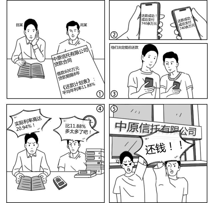 根據(jù)合同約定,田某、周某按期歸還了15期本息。隨后,田某、周某提前還款,實(shí)際支付本息740余萬元。田某、周某認(rèn)為實(shí)際利率高達(dá)20.94%,遠(yuǎn)高于合同約定的11.88%,且中原信托在借款合同履行過程中從未披露過實(shí)際利率,遂向法院提起訴訟,要求中原信托退還多收的利息88萬余元以及占用該資金的利息損失。