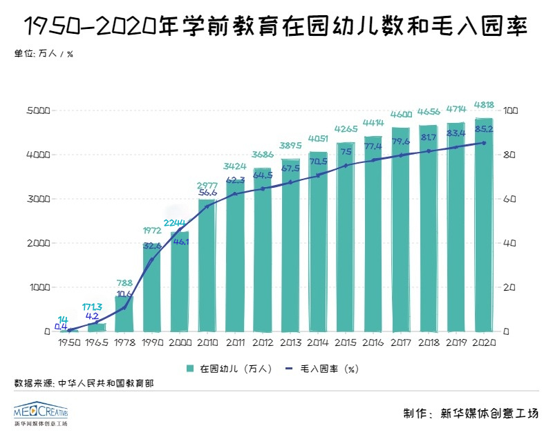 新中國成立以來,我國學前教育實現(xiàn)了快速發(fā)展。1950年我國學前教育在園兒童人數(shù)僅為14萬人,這個數(shù)字在2020年達到4818萬,學前教育毛入園率更是從1950年0.4%提高到2020年的85.2%。