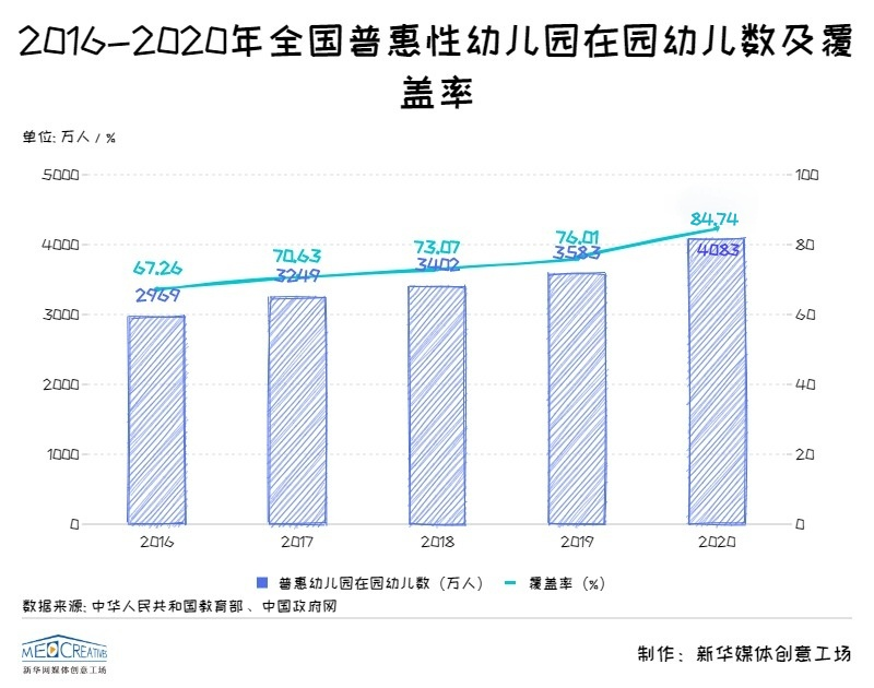 普惠性幼兒園覆蓋率逐年攀升,2020年中國普惠性幼兒園覆蓋率達84.74%,比2016年增加17.5個百分點(2016年開始統(tǒng)計普惠性幼兒園覆蓋率) ,超額完成《中共中央國務院關(guān)于學前教育深化改革規(guī)范發(fā)展的若干意見(2018年11月7日)》(后簡稱《意見》)中“到2020年,普惠性幼兒園覆蓋率(公辦園和普惠性民辦園在園幼兒占比)達到80%”的目標任務。