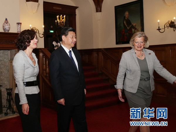 ????3月24日,國家主席習近平在海牙會見荷蘭議會一院議長布勒克-克諾爾(右)和二院議長范米爾滕伯格。 新華社記者 劉衛(wèi)兵 攝