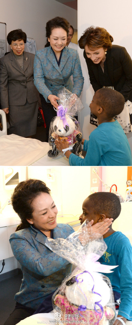 ???? 彭麗媛走進(jìn)哮喘病患兒毛蘇的病房,向他贈送了可愛的熊貓玩具。臨別,毛蘇想擁抱一下她,彭麗媛立刻蹲下身,撫摸著毛蘇可愛的小臉蛋,把他擁在懷里,毛蘇高興地親吻了彭麗媛的臉頰。