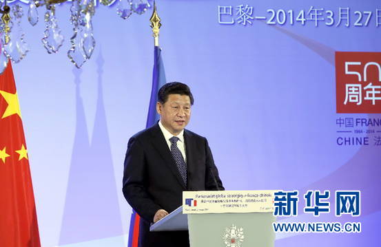 ????新華網(wǎng)巴黎3月27日電(記者李斌 劉華)中法建交50周年紀(jì)念大會27日在巴黎舉行。國家主席習(xí)近平和法國總統(tǒng)奧朗德共同出席并發(fā)表重要講話。習(xí)近平總結(jié)中法關(guān)系50年來的成功經(jīng)驗,闡述對兩國關(guān)系發(fā)展的政策主張,希望中法兩國人民在實現(xiàn)中國夢和法國夢的過程中相互理解、相互幫助,共同實現(xiàn)“中法夢”。