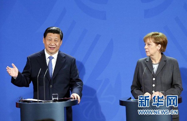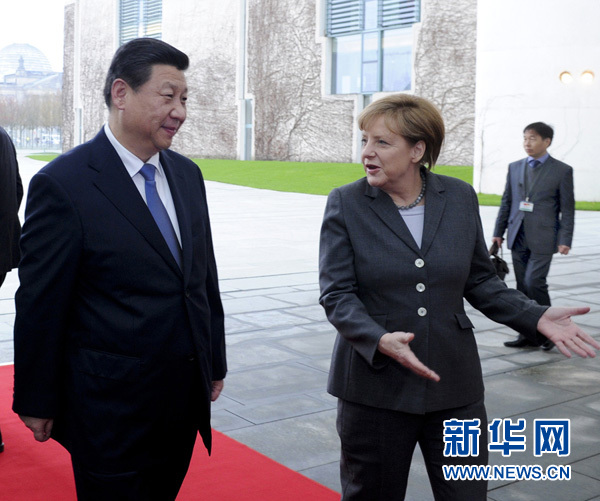 ????兩國領(lǐng)導(dǎo)人還共同會見了記者。習(xí)近平指出,中德關(guān)系發(fā)展到今天,兩國務(wù)實合作的效應(yīng)不再是簡單的一加一等于二,而是遠(yuǎn)遠(yuǎn)大于二。深化中德合作,利在兩國,惠及歐洲和世界。我這次訪問期間,雙方?jīng)Q定將兩國關(guān)系提升為全方位戰(zhàn)略伙伴關(guān)系,并簽署了多項合作協(xié)議。中德關(guān)系站在新起點上,面臨新的發(fā)展機遇。相信到2020年,歐洲的德國和亞洲的中國,經(jīng)濟(jì)實力將更強大,互利合作將更緊密,在國際事務(wù)中的影響將進(jìn)一步提高。