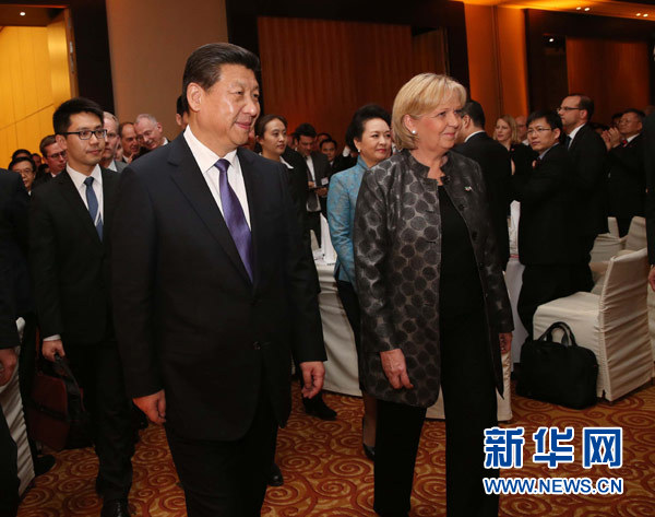 ??? 3月29日,國(guó)家主席習(xí)近平在杜塞爾多夫出席中德工商界舉行的招待會(huì)并發(fā)表題為《把握中國(guó)機(jī)遇,實(shí)現(xiàn)共同發(fā)展》的重要講話。這是習(xí)近平等步入招待會(huì)會(huì)場(chǎng)。新華社記者劉衛(wèi)兵攝