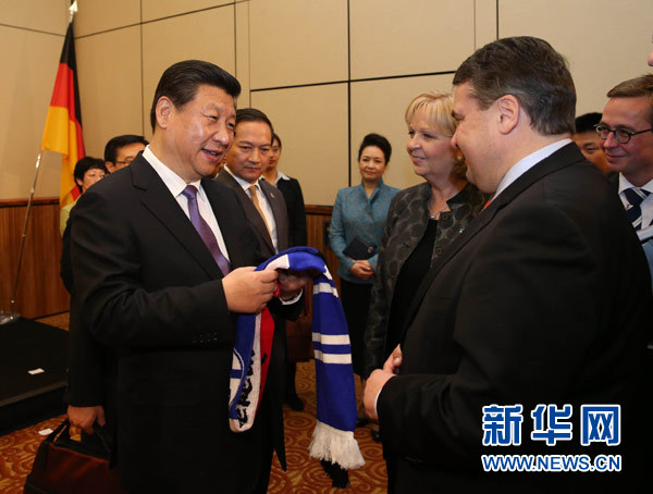 ??? 3月29日,中國(guó)國(guó)家主席習(xí)近平在杜塞爾多夫出席中德工商界舉行的招待會(huì)并發(fā)表題為《把握中國(guó)機(jī)遇,實(shí)現(xiàn)共同發(fā)展》的重要講話。這是招待會(huì)開(kāi)始前,習(xí)近平在會(huì)見(jiàn)中德企業(yè)家代表時(shí),德國(guó)副總理兼經(jīng)濟(jì)和能源部長(zhǎng)加布里爾(前右)向習(xí)近平贈(zèng)送一家德國(guó)足球俱樂(lè)部球迷標(biāo)志性圍巾。新華社記者劉衛(wèi)兵攝