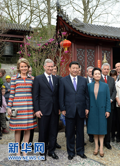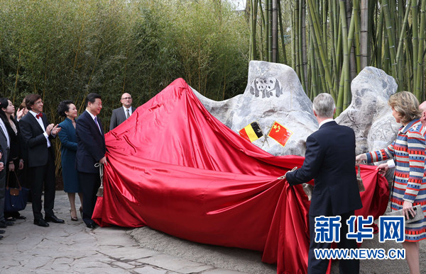 ????習(xí)近平和夫人彭麗媛抵達(dá)時,受到菲利普國王和瑪?shù)贍柕峦鹾?、比利時首相迪呂波熱情迎接。兩國領(lǐng)導(dǎo)人一同步入中國園。亭臺樓閣、雕梁畫棟、鳥語花香,這里宛如一幅恬靜祥和的中華寫意畫。兩國元首夫婦沿著回廊曲徑,穿過青翠竹林,前往大熊貓園。他們邊走邊談,回顧中比兩國友好交往。
