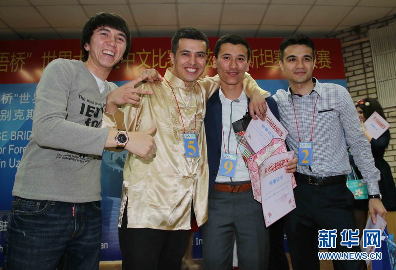 4月25日,烏茲別克斯坦塔什干國立東方學(xué)院大禮堂比賽現(xiàn)場,獲獎選手在合影留念。