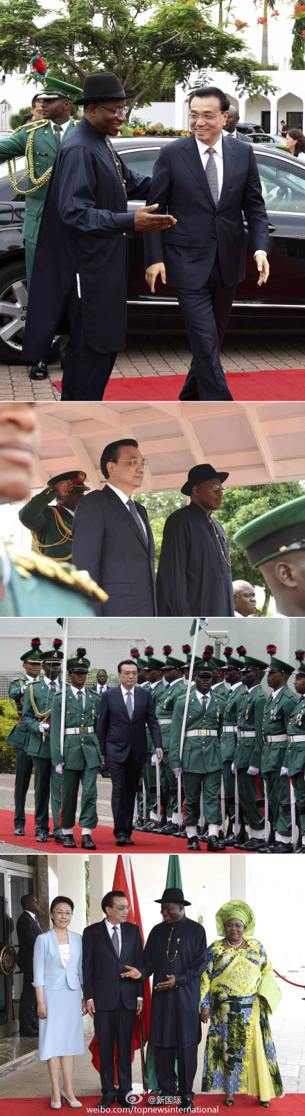??? 新華網(wǎng)北京5月7日電? 據(jù)新華社“新國(guó)際”微博報(bào)道,當(dāng)?shù)貢r(shí)間7日上午,尼日利亞總統(tǒng)喬納森在總統(tǒng)府為李克強(qiáng)總理舉行隆重歡迎儀式,現(xiàn)場(chǎng)鳴響禮炮,軍樂(lè)隊(duì)奏兩國(guó)國(guó)歌,李克強(qiáng)檢閱了儀仗隊(duì)。