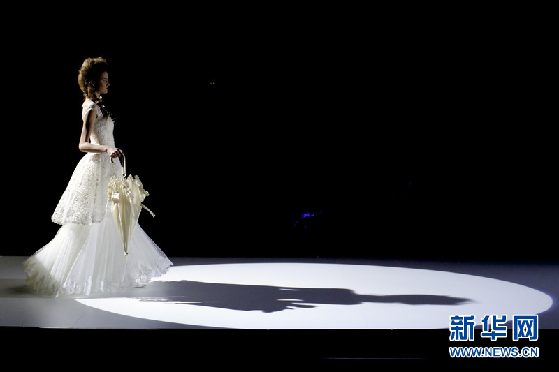 模特在T臺上展示西班牙女服裝設計師 Inmaculada Garcia的婚紗作品。Inmaculada Garcia同時也是來自巴塞羅那當?shù)氐囊粋€婚紗品牌。