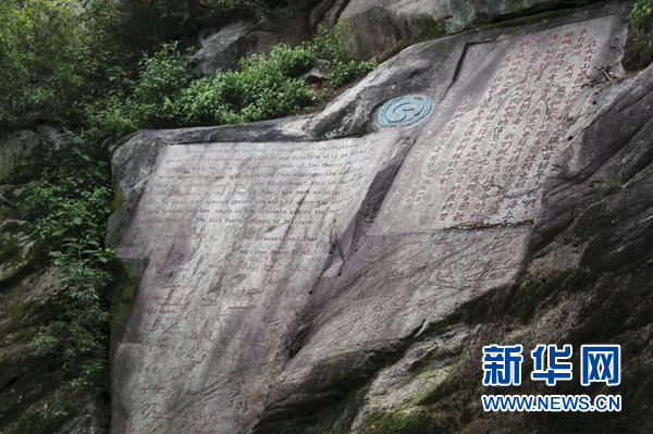 ??? 走進那段記錄在石壁上的海絲歷史聯(lián)合國教科文組織“海絲”考察隊于1991年觀摩祈風石刻,認定此為宋元時期海上絲綢之路起點的文物佐證,并做中英文新刻(5月8日攝)。 26年來,今年65歲的文物管理所原所長胡家其老人已經(jīng)記不得多少次向人們講述九日山作為宋元時期海上絲綢之路起點的歷史,但他從不言倦。福建泉州豐州鎮(zhèn)九日山因“山中無石不刻字”而與眾不同。這座海拔只有一百多米的小山現(xiàn)存古代摩崖石刻77方,其中宋代石刻61方。這61方石刻中又有10方直接與海上絲綢之路有關,記錄了公元1174年至1266年期間11次官辦祈風儀式。新華社記者 姜克紅 攝