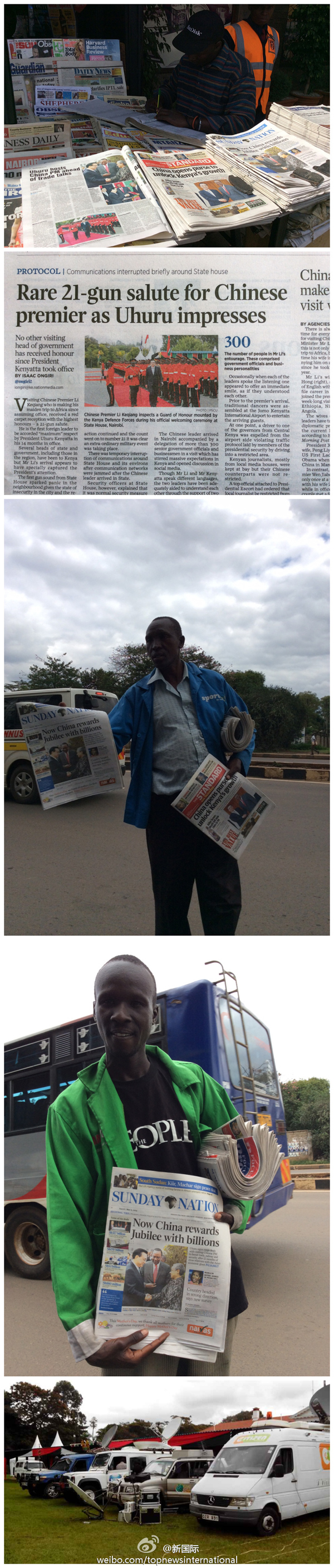 ????新華網(wǎng)北京5月11日電? 據(jù)新華社“新國(guó)際”微博報(bào)道,連日來(lái),肯尼亞各大媒體紛紛對(duì)李克強(qiáng)總理訪肯進(jìn)行全方位報(bào)道。主要報(bào)紙均在頭版頭條大篇幅介紹訪問情況,并開辟專版引述李總理講話對(duì)肯中關(guān)系進(jìn)行述評(píng)??先箅娨暸_(tái)現(xiàn)場(chǎng)直播李總理和肯雅塔總統(tǒng)會(huì)見記者實(shí)況??厦襟w還高度評(píng)價(jià)中國(guó)在文化教育等領(lǐng)域的軟實(shí)力外交。