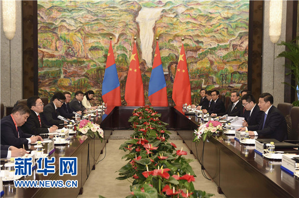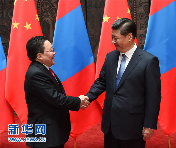 習(xí)近平強(qiáng)調(diào),我十分關(guān)心和高度重視中蒙關(guān)系。兩國領(lǐng)導(dǎo)人要保持密切交往和戰(zhàn)略溝通,實(shí)實(shí)在在推進(jìn)兩國合作。兩國立法機(jī)構(gòu)、政黨、軍隊也要加強(qiáng)交往。中蒙經(jīng)濟(jì)互補(bǔ)性強(qiáng)。中方開展對蒙合作堅持互利雙贏原則,不搞我贏你輸、我多你少。中方愿本著礦產(chǎn)資源開發(fā)、基礎(chǔ)設(shè)施建設(shè)、金融合作“三位一體、統(tǒng)籌推進(jìn)”原則,以互聯(lián)互通建設(shè)為優(yōu)先方向,以建設(shè)絲綢之路經(jīng)濟(jì)帶為契機(jī),拓展兩國合作,鼓勵有實(shí)力的中國企業(yè)赴蒙投資興業(yè)。中方支持蒙方積極參與國際和地區(qū)事務(wù),愿同蒙方加強(qiáng)在聯(lián)合國、上海合作組織等框架內(nèi)合作。