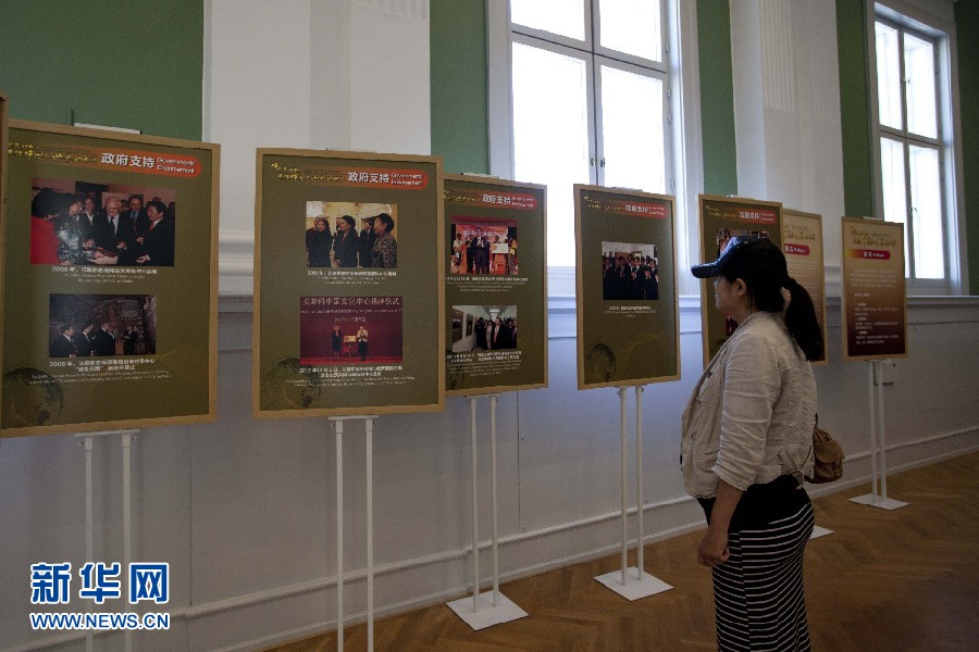 圖為一民眾駐足欣賞中國文化中心信息圖片展?
