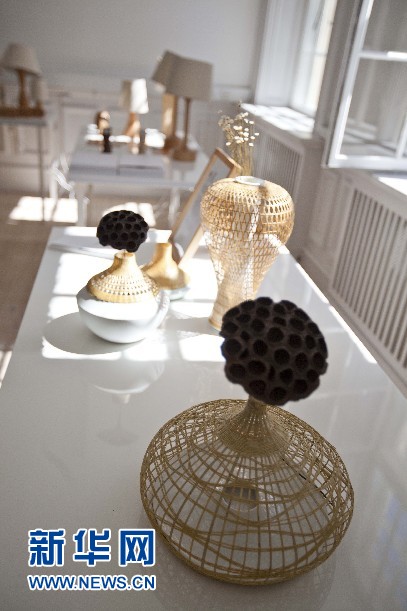 圖為10日所拍攝的“融?工藝設(shè)計(jì)生活”設(shè)計(jì)展上用竹條編織的花瓶。