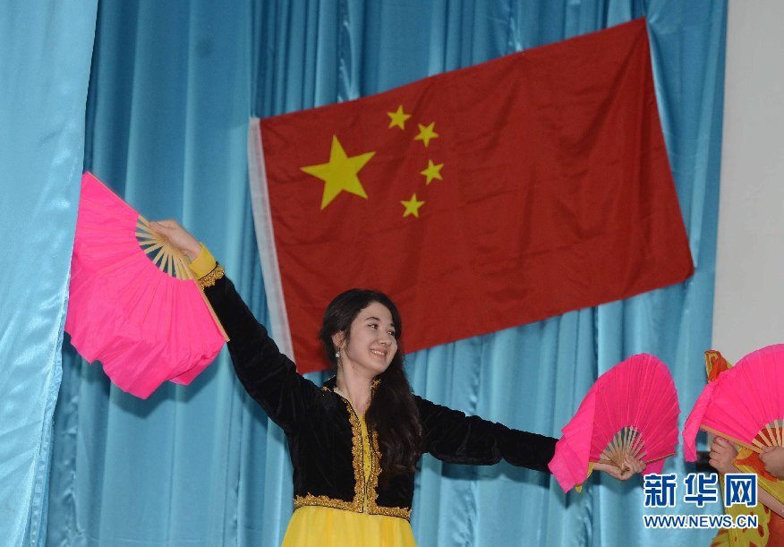 6月9日,學(xué)生代表在烏茲別克斯坦首都塔什干的烏世界語言大學(xué)禮堂表演節(jié)目。