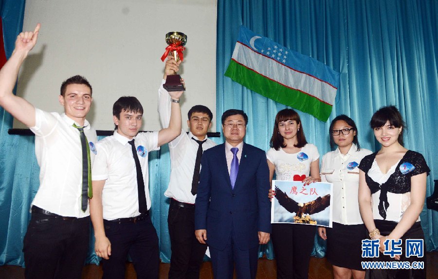 ??? 6月9日,烏茲別克斯坦首都塔什干的烏世界語(yǔ)言大學(xué)禮堂,中國(guó)駐烏茲別克斯坦使館孫立杰大使在向獲得冠軍的鷹之隊(duì)頒獎(jiǎng)并合影留念。。