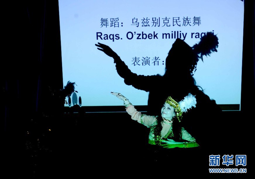 6月9日,學生代表在烏茲別克斯坦首都塔什干的烏世界語言大學禮堂表演節(jié)目。