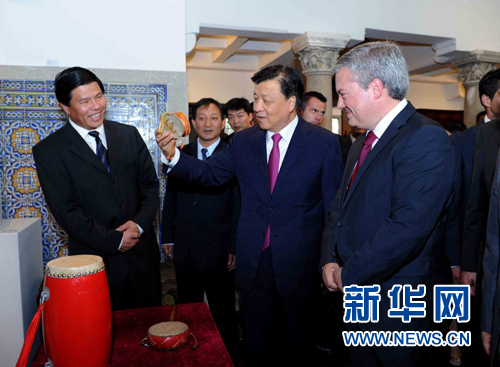 ??? 6月17日至19日,應(yīng)葡萄牙政府邀請(qǐng),中共中央政治局常委、中央書(shū)記處書(shū)記劉云山對(duì)葡萄牙進(jìn)行正式訪問(wèn)。這是6月19日,劉云山在波爾圖出席慶祝中國(guó)葡萄牙建交35周年中國(guó)文化周開(kāi)幕式活動(dòng),參觀中葡文化展。 新華社記者 饒愛(ài)民 攝