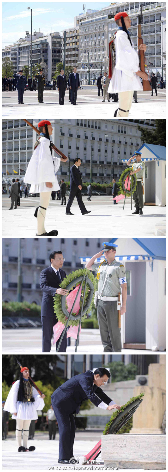 ??? 新華網北京6月20日電 據新華社“新國際”微博報道,正在希臘訪問的李克強總理19日向希臘無名戰(zhàn)士紀念碑獻花圈。該紀念碑1932年建成,碑上鐫刻公元前5世紀希臘政治家伯里克利斯一篇悼詞中的兩句名言:“全世界杰出戰(zhàn)士之墓”、“安放無名氏的床第”,及希臘從上世紀初到五十年代與外國交戰(zhàn)的戰(zhàn)役名稱和地名。