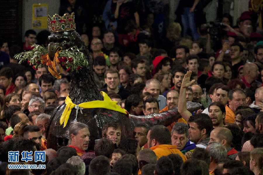 西班牙貝爾加(Berga)市的La Patum節(jié)上,頭戴皇冠的老鷹玩偶穿過狂歡的人群。
