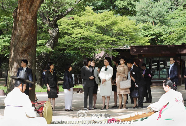 ???? 新華網(wǎng)北京7月3日電? 據(jù)新華社“新國際”微博報道,習近平主席夫人彭麗媛3日下午在韓國官員陪同下參觀被列為世界文化遺產(chǎn)的昌德宮,了解宮殿建筑歷史、音樂傳承等情況,并欣賞韓國傳統(tǒng)樂器伽倻琴散調(diào)表演,對藝術(shù)家的精彩演出表示高度贊賞。彭麗媛說,中韓友誼源遠流長,歡迎韓國朋友多到中國參觀訪問。