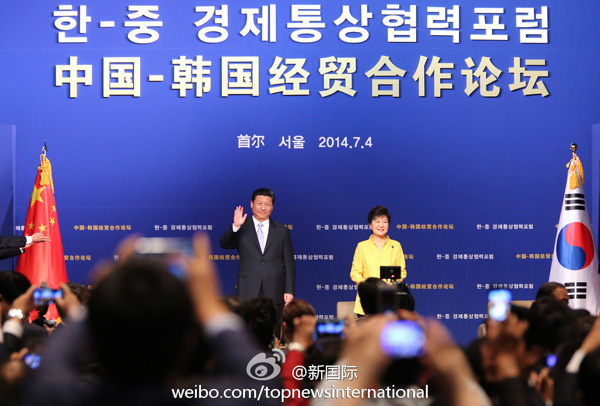 新華網(wǎng)北京7月4日電 據(jù)新華社“新國(guó)際”微博報(bào)道,習(xí)近平表示,中韓應(yīng)共同反對(duì)保護(hù)主義,兩國(guó)企業(yè)可以在制定國(guó)際標(biāo)準(zhǔn)、開拓國(guó)際市場(chǎng)、參與區(qū)域一體化進(jìn)程等方面加強(qiáng)探討、拓展合作。中方歡迎韓國(guó)參與亞洲基礎(chǔ)設(shè)施投資銀行籌建,共同推動(dòng)地區(qū)互聯(lián)互通和基礎(chǔ)設(shè)施建設(shè)。